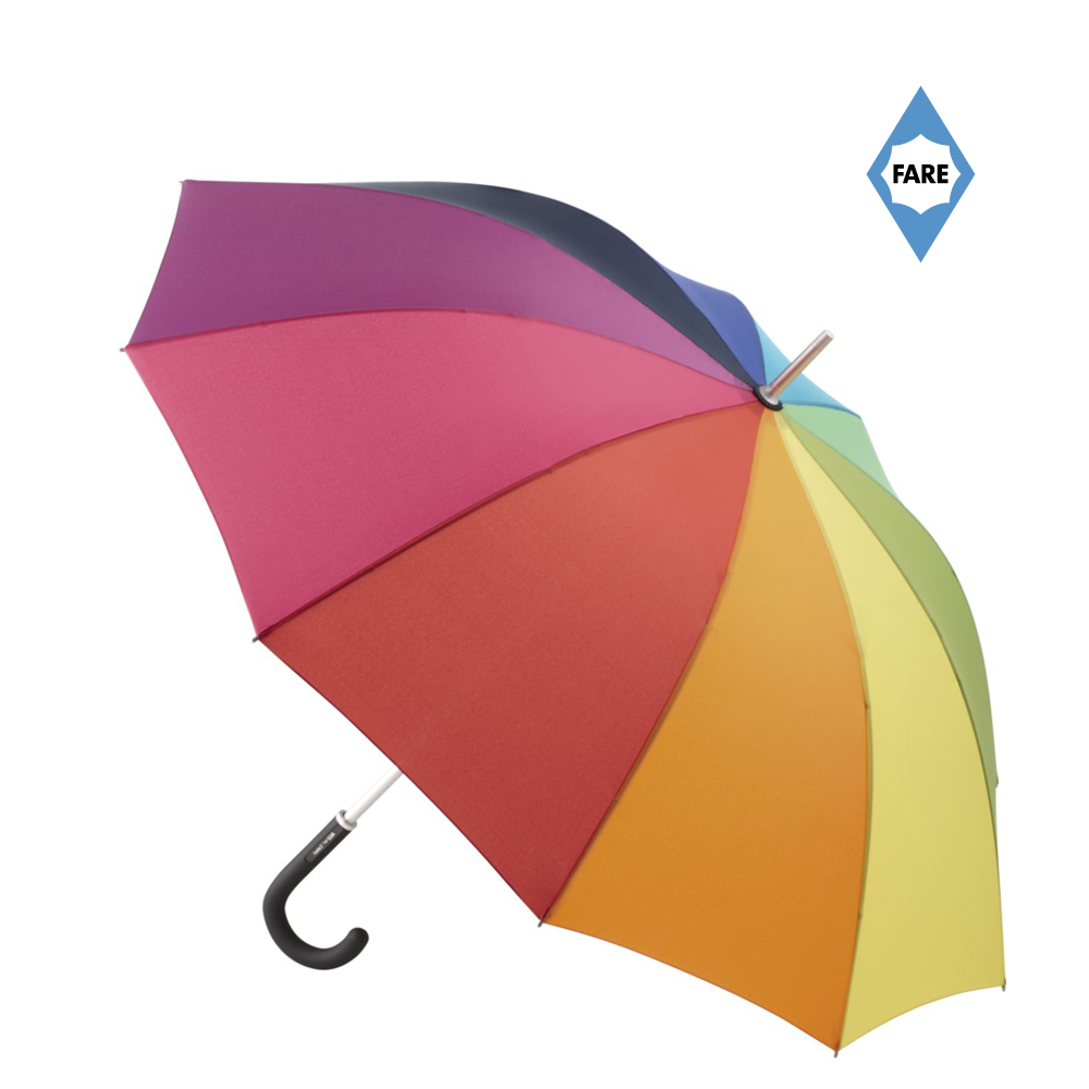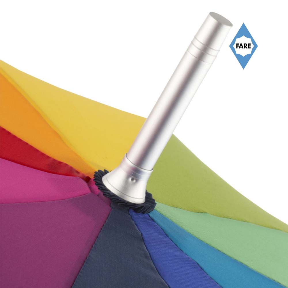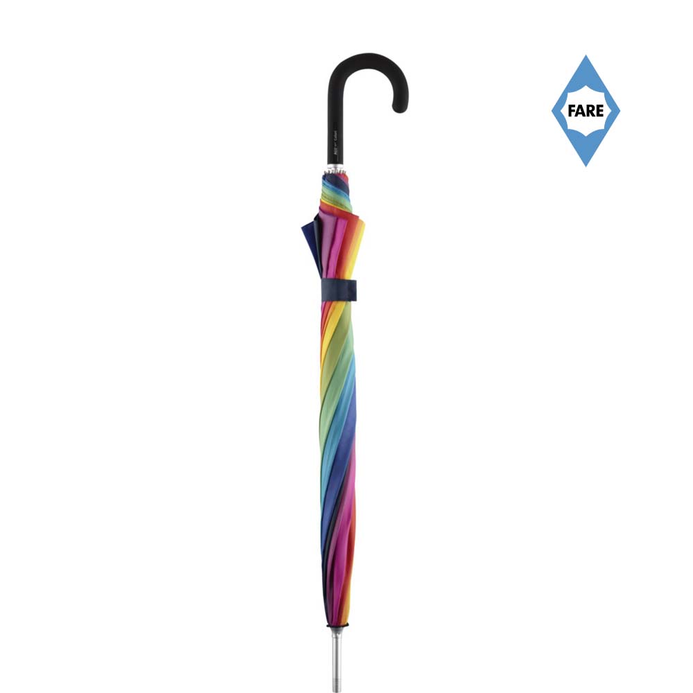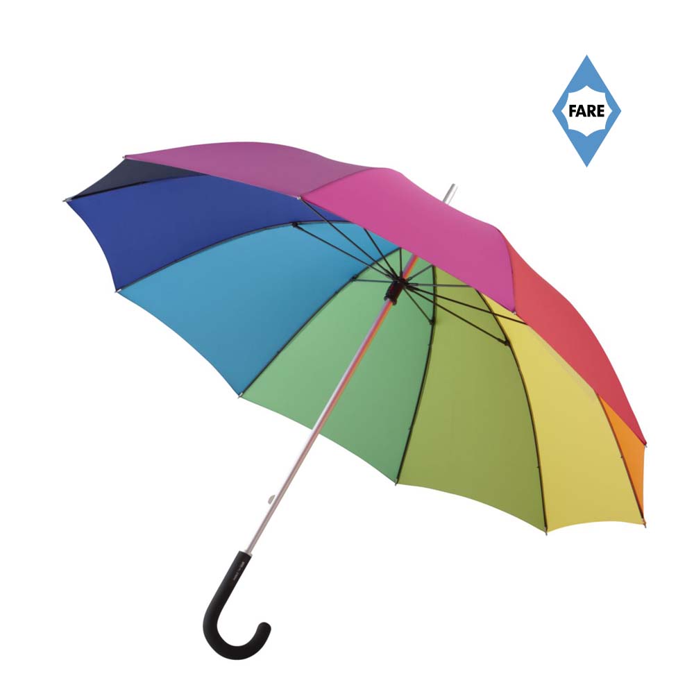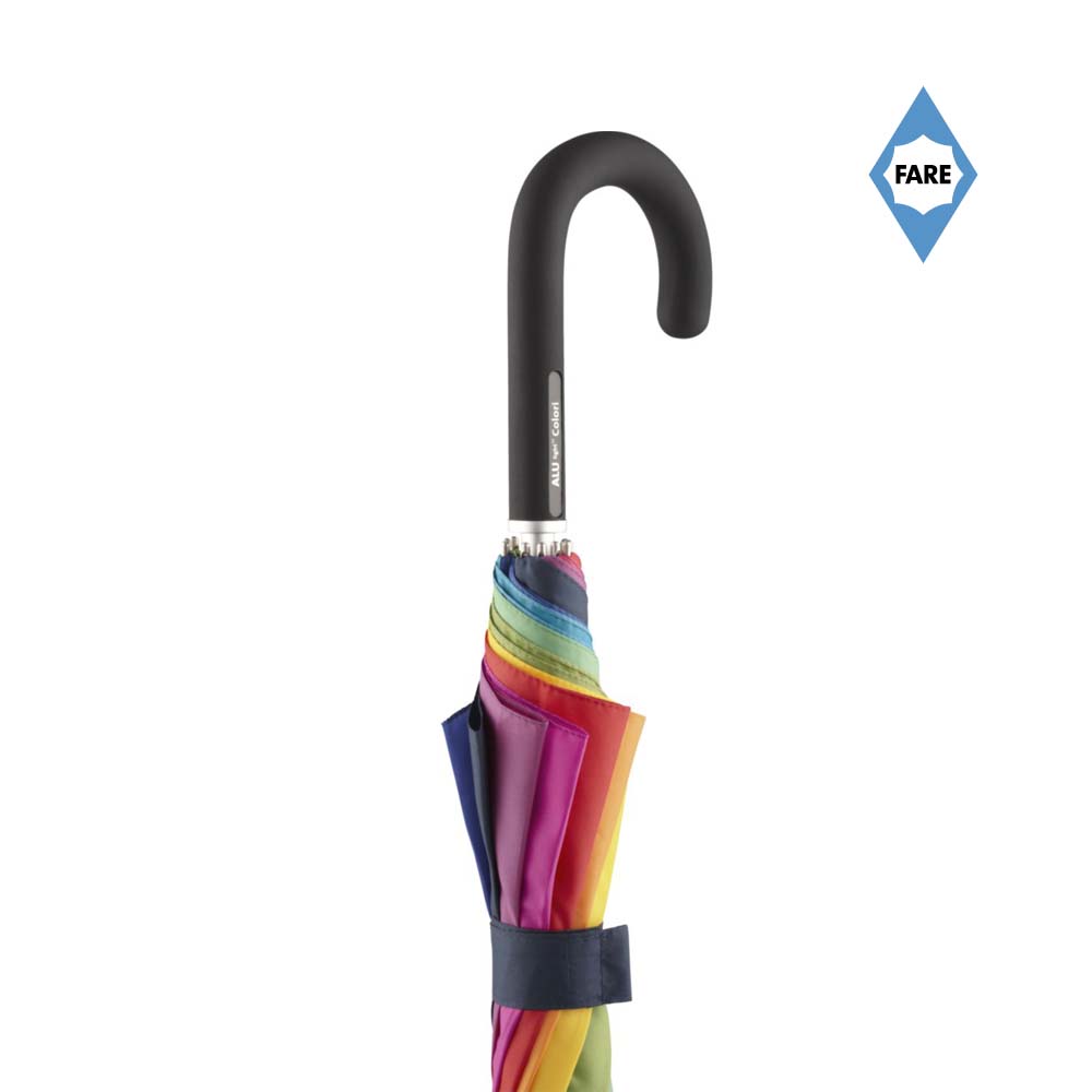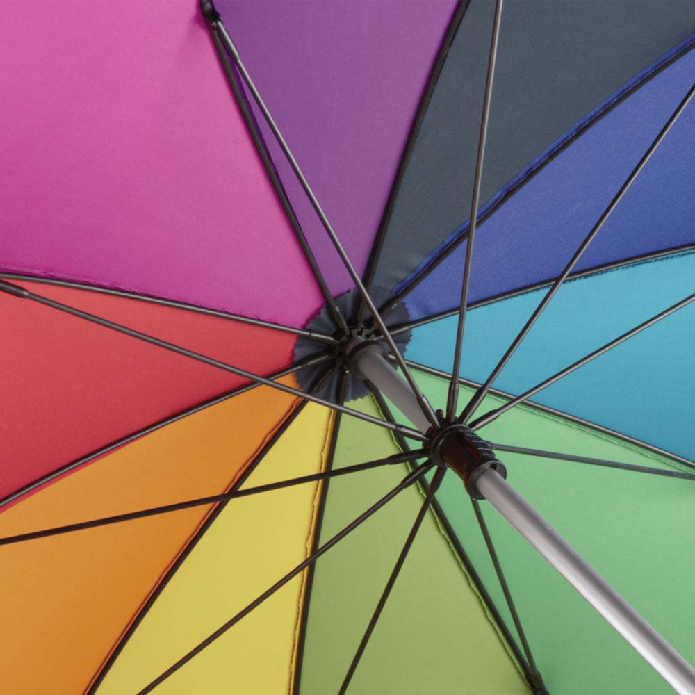 Ombrello in 100% poliestere, manico: plastica, asta: alluminio. Ombrello di media misura, dotato di bacchette flessibili in fibra di vetro, manico nero soft-touch. Diametro: 115 cm, lunghezza da chiuso: 92 cm, 10 pannelli.