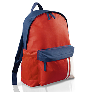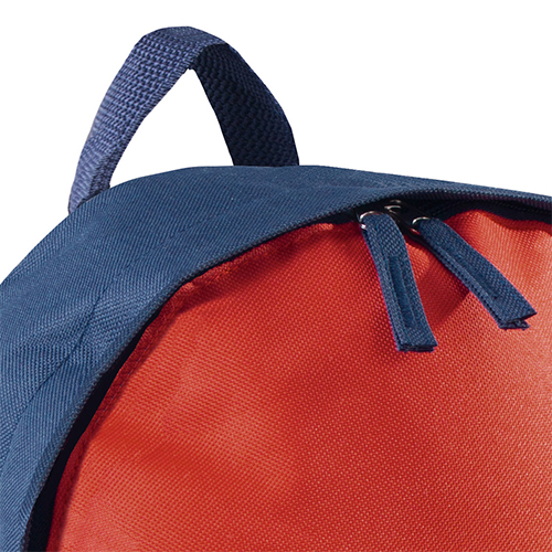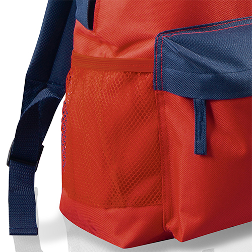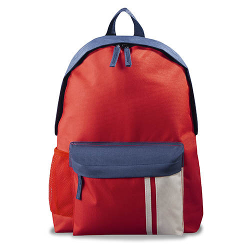 Zaino con tasca frontale con zip, tasca laterale in rete, spallacci regolabili, schienale imbottito, maniglia in nastro, tira zip in tessuto con impunture in contrasto.