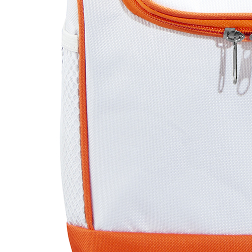 Borsa frigo interamente imbottita in materiale termico, ampia apertura con zip, tasca laterale in rete e maniglia in nastro.