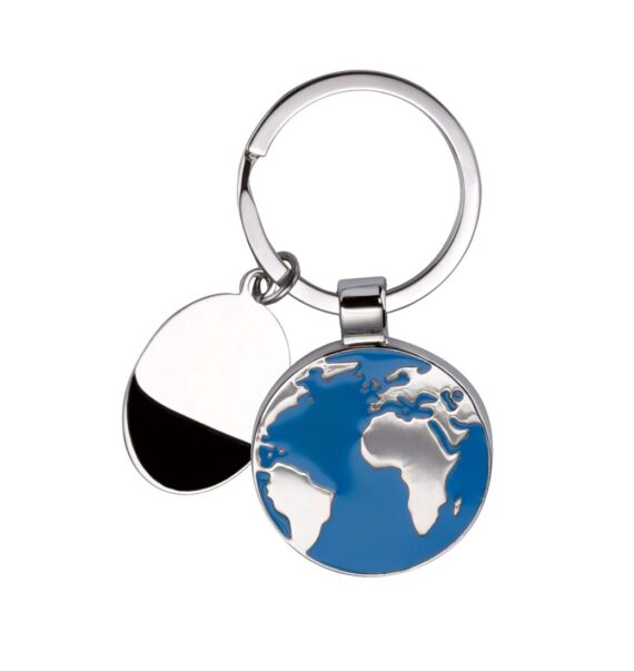 Portachiavi in metallo satinato a forma di mondo confezionato in scatolina da regalo nera
