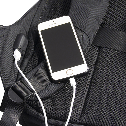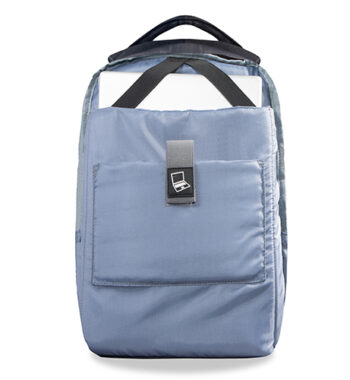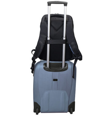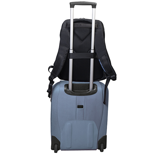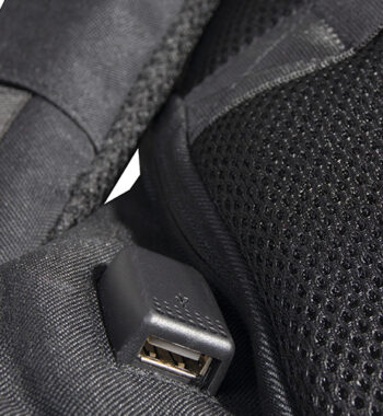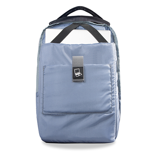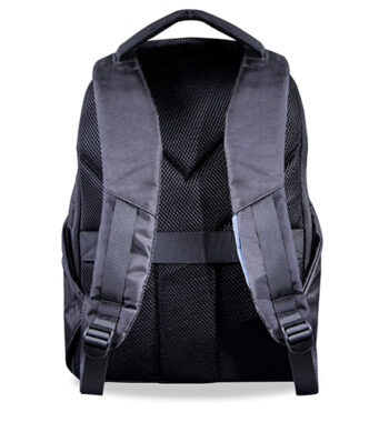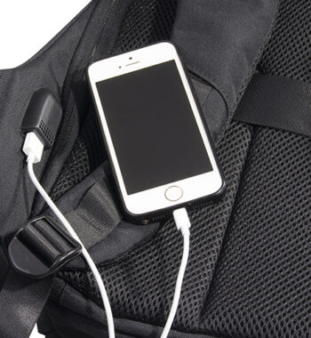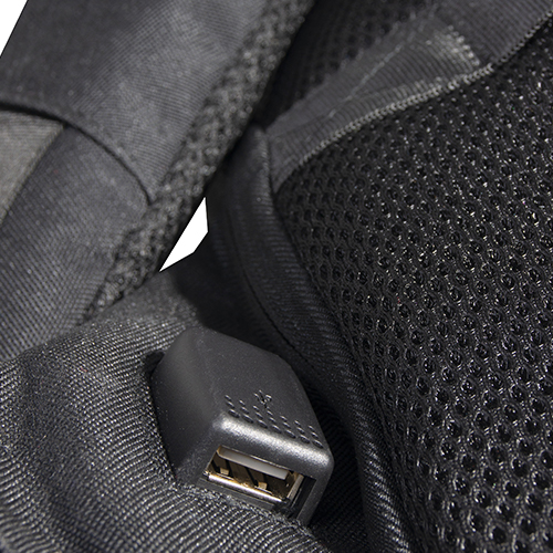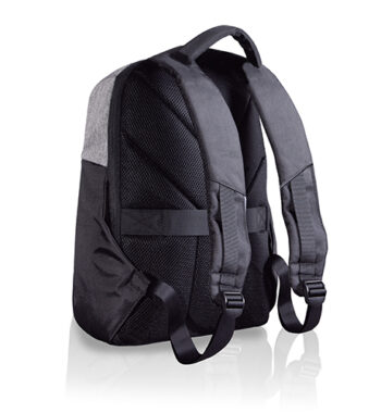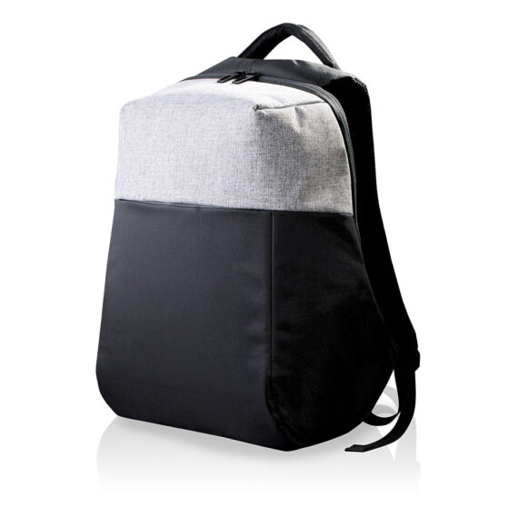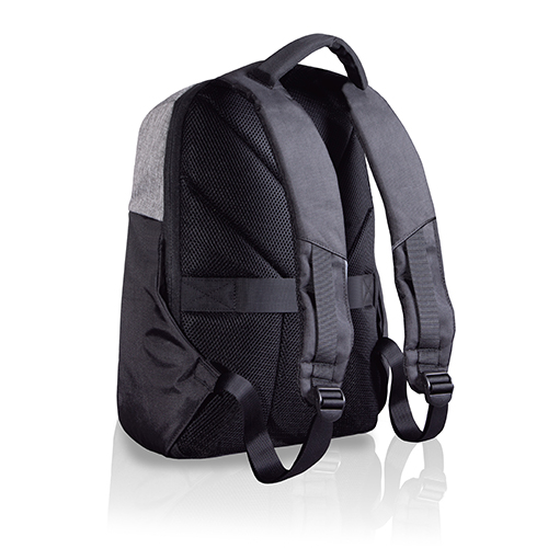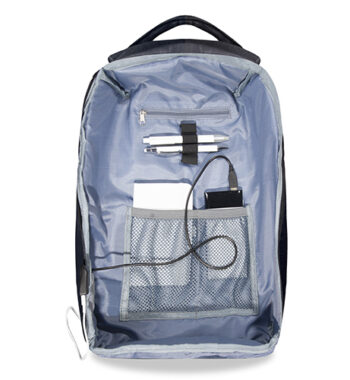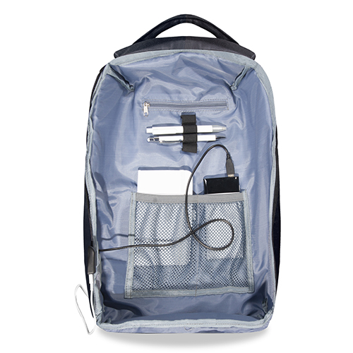 Zaino porta computer anti scippo. Comparto principale accessoriato con un alloggiamento imbottito per il laptop e uno per il tablet, organizer per le penne, doppia tasca in rete e tasca aggiuntiva con zip. Cavo USB interno con uscita nella parte laterale dello zaino. Spallacci ergonomici foderati in materiale traspirante, maniglia imbottita, tira zip in metallo e fascia posteriore per possibilità di trasporto su trolley. Il comparto porta PC può contenere al massimo un portatile da 15′.