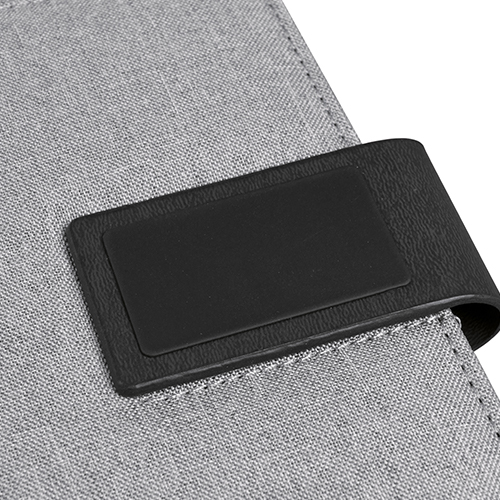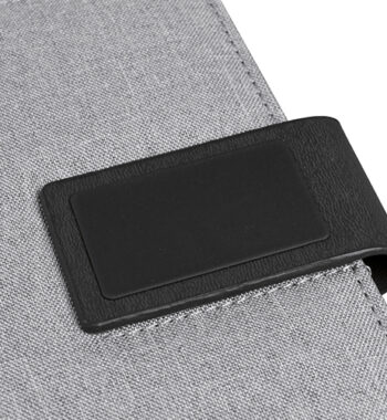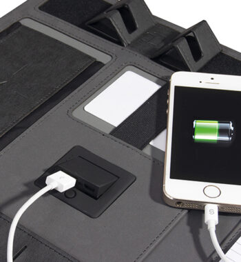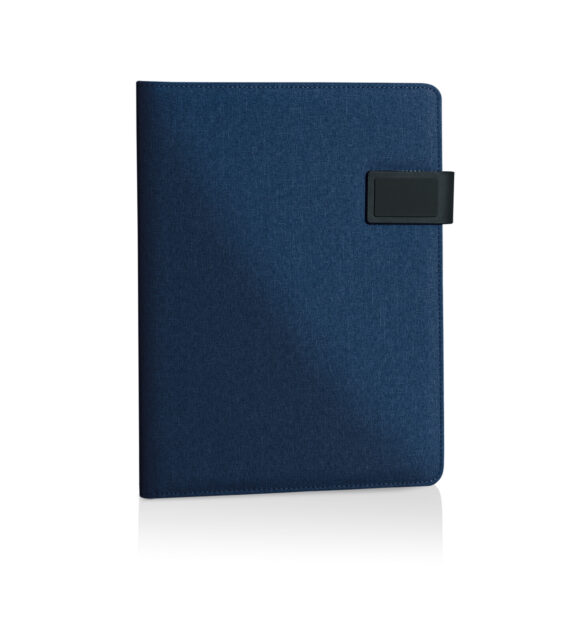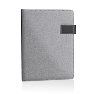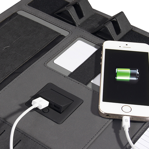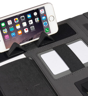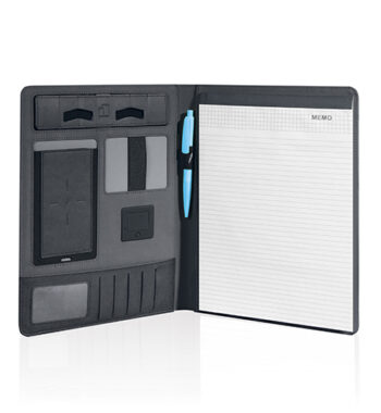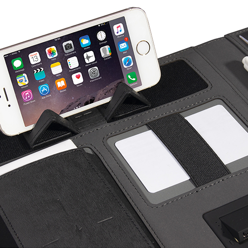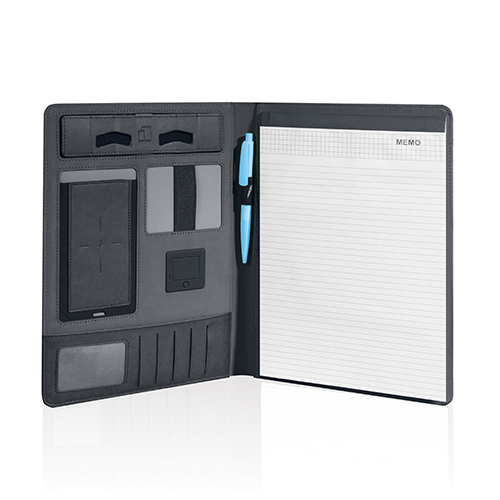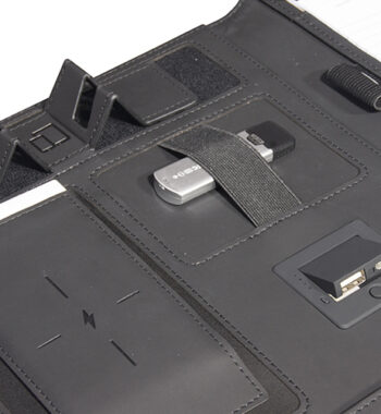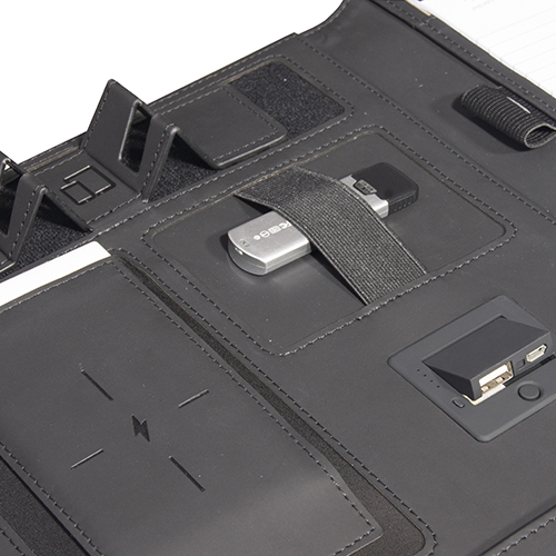 Porta blocco con interno attrezzato molto accuratamente con power bank wireless da 4.000 mAh e “charging station”. Supporto per device mobile, tasche di varie fogge e varie possibilità di alloggiamento per gli accessori e penna. Chiusura con fibbia e placca magnetica in metallo gommato. Blocco incluso.