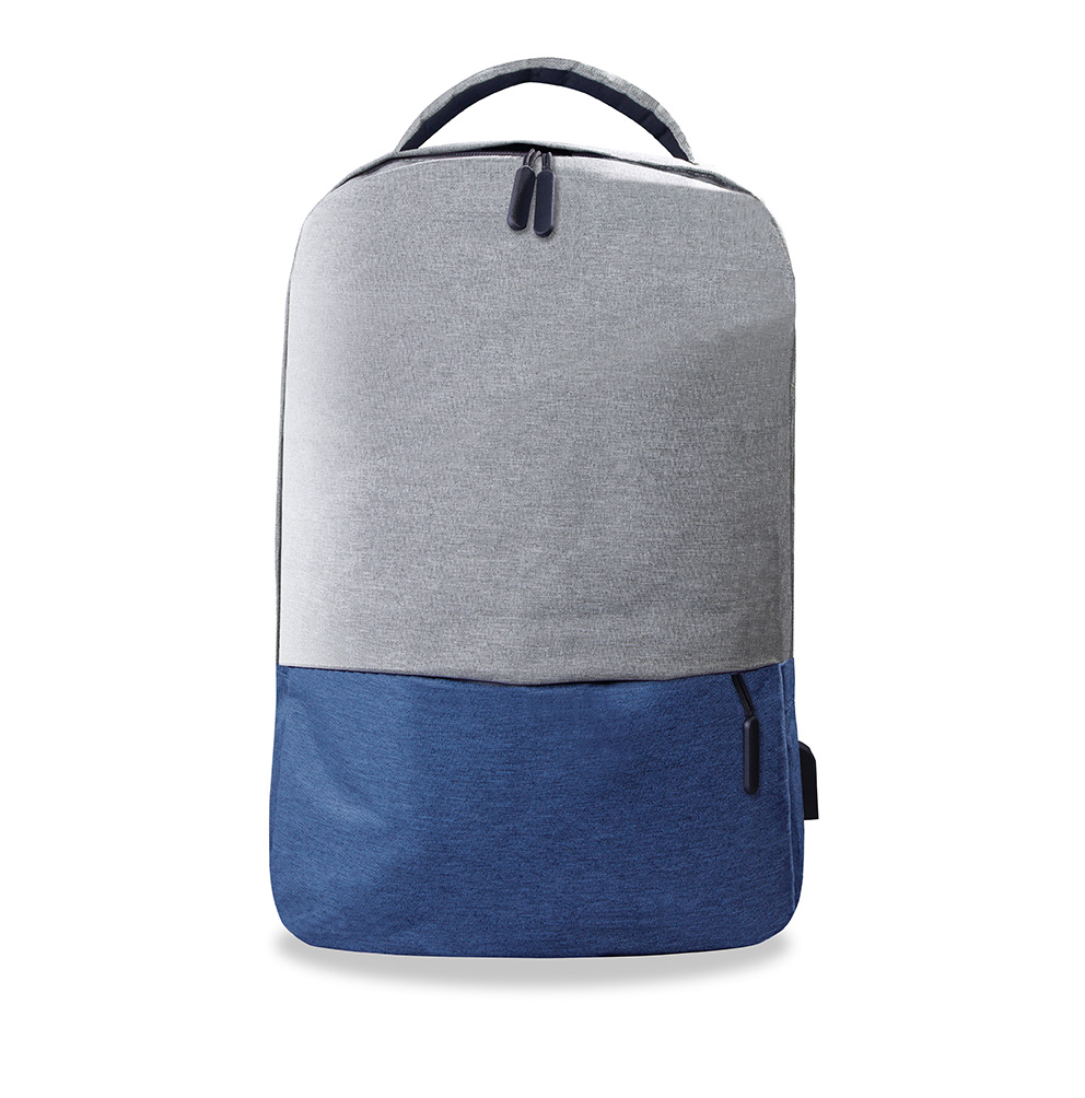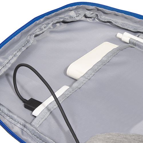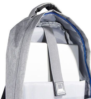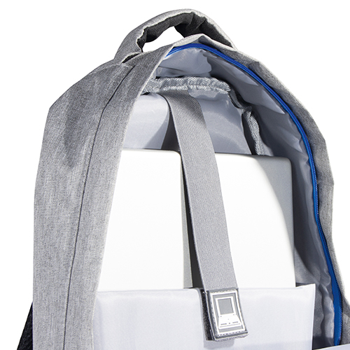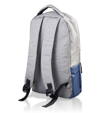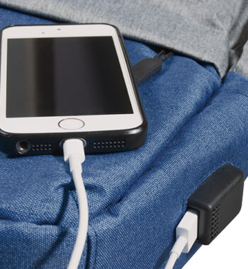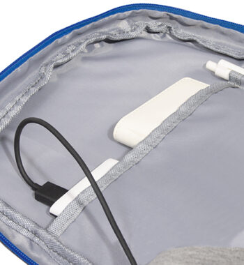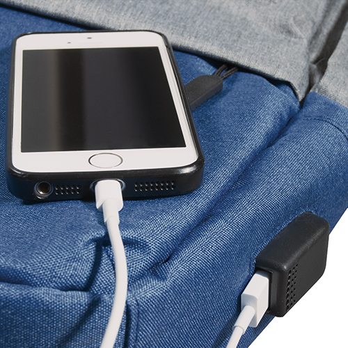 Zaino porta computer con comparto principale accessoriato con alloggiamento imbottito, organizer e cavo USB interno con uscita nella parte laterale dello zaino che permette di ricaricare uno smartphone utilizzando un power bank senza la necessità di estrarlo dallo zaino. Tasca frontale con zip. Spallacci ergonomici foderati in materiale traspirante. Maniglia imbottita, laccetti tira zip con accessorio in plastica. Il comparto porta PC può contenere al massimo un portatile da 15′.
